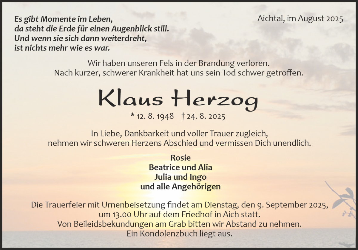 Sprechen Sie im Kondolenzbuch den Hinterbliebenen Ihr Beileid aus und teilen Sie persönliche Gedanken und Erinnerungen mit anderen.